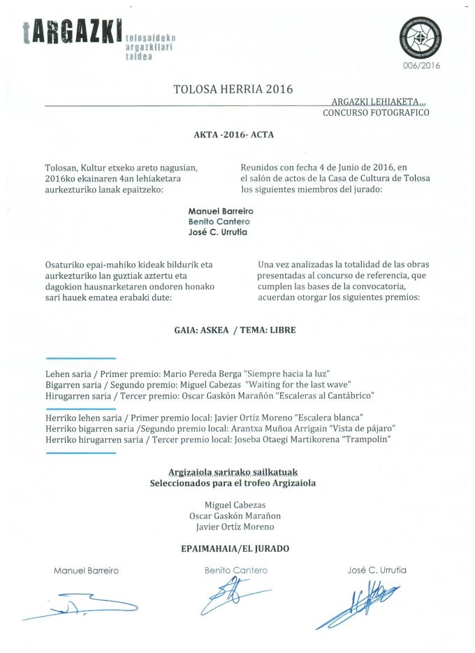Ayer se llevó a cabo el fallo del jurado del concurso fotográfico Tolosa Herria en su edición de 2016. Esta es el acta y las fotos premiadas.¡Enhorabuena a los ganadores!